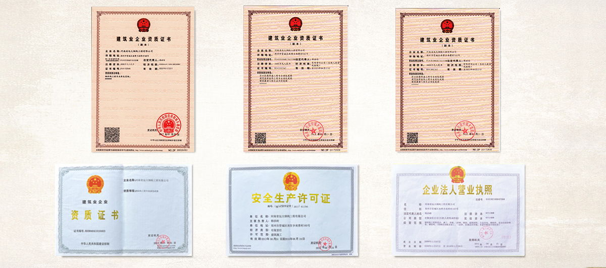 公司擁有“鋼結(jié)構(gòu)制造壹級(jí)”和“鋼結(jié)構(gòu)工程專業(yè)承包壹級(jí)”專業(yè)資質(zhì),獲得業(yè)內(nèi)認(rèn)可的各類專利及榮譽(yù)資質(zhì)證書;公司及產(chǎn)品已通過了ISO9001質(zhì)量管理體系認(rèn)證和省級(jí)檢測、鑒定,安全耐用。